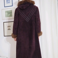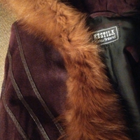 Kestilän mokkatakki turkissomistein. Huppu. Taskut. Lämmin vanuvuori. Turkisklipsikiinnitys. Väri tumma luumu. Koko noin 38-40. Kainalo-kainalo 54cm, niska-helma 121cm.