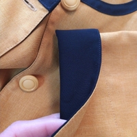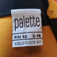 Kevyt Kielo-Tuotteen jakku. Väri poltettu keltainen, mustat yksityiskohdat. Koko 40. Kainalo-kainalo 57cm, niska-helma 81cm, hiha kainalosta, kun hihansuu käännettynä 32cm.