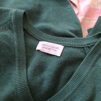 Metsänvihreä villaneule. V-kaula-aukko. Vähän pidempi malli. Kokomerkintä S. Kainalo-kainalo 56cm, niska-helma 80cm.