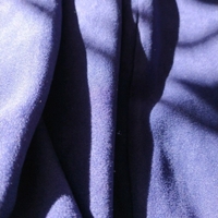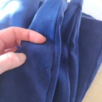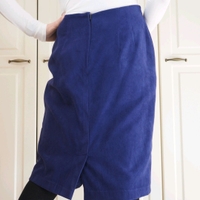 Sininen hame. Koko 42. Takana pukeutumisvetoketju ja halkio. Vasemman sauman lähellä reikä, joka on paikattu muutamalla tikillä (kuva 4). Materiaali säämiskäisen näköistä ja tuntuista. Vyötärönympärys 84cm, hameen pituus 66cm.