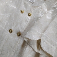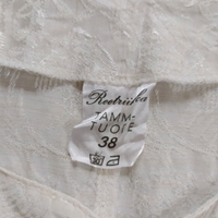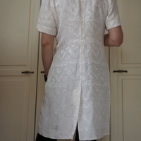 Kotimainen mekko. Koko 38. Kaunis kudottu kangas. Kultaiset napit helmiäiskoristein. Takana halkio. Hihansuissa koristemuotoilu. Kainalo-kainalo 49cm, vyötärönympärys noin 88cm, niska-helma 96cm.