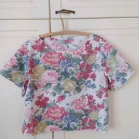 Kotiompelijan tekemä kukkatoppi. Materiaalin arvioisin olevan puuvillaa. Ei jousta. Kokoarvio M. Kainalo-kainalo 54cm, niska-helma 49cm, olka-olka 45cm.