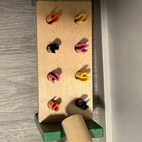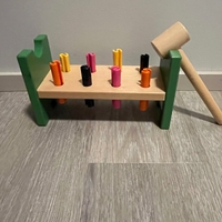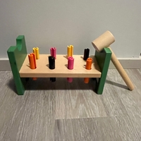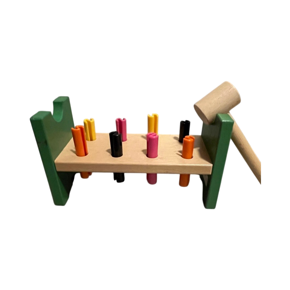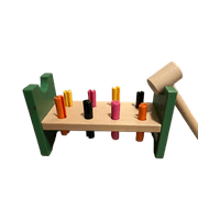 Puinen lasten hakkauspeli vasaralla ja värillisillä tikuilla.