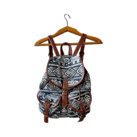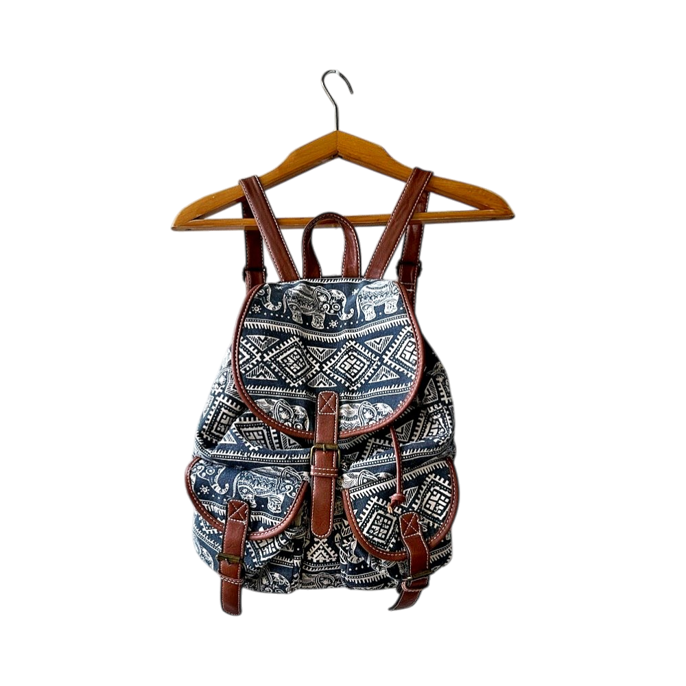 Sini-valko-ruskea kuvioitu reppu. Repussa säädettävät olkaimet sekä yksi isompi ja muutama pienempi tasku. Pohja 31 cm x 16 cm ja korkeus 29 cm.