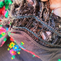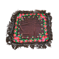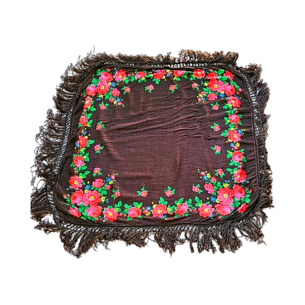 Musta huivi punaisilla kukkakuvioilla ja hapsuilla reunoissa.70cmx70cm villa 100%