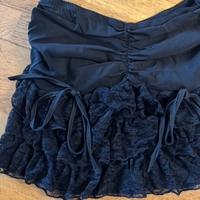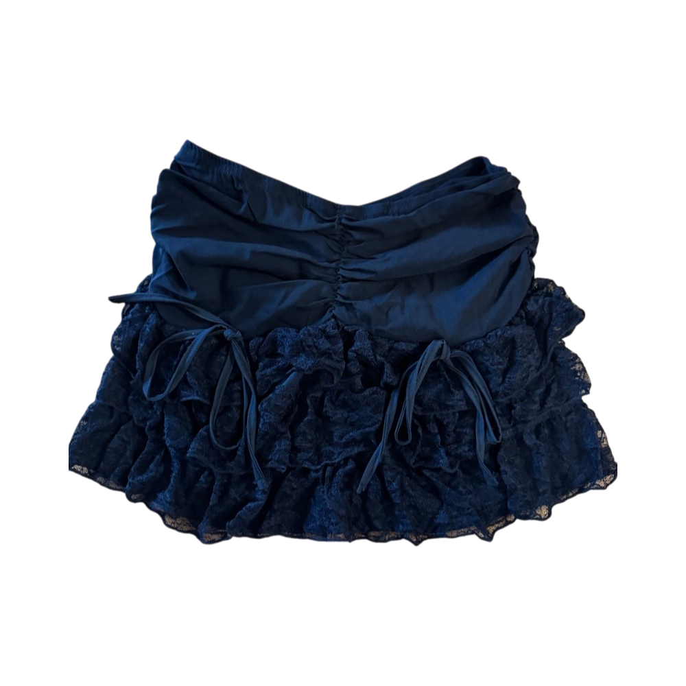 Lyhyt röyhelöhame, pitsiyksityiskohdilla ja nauhasomisteilla.
