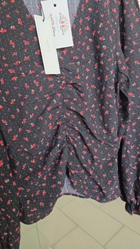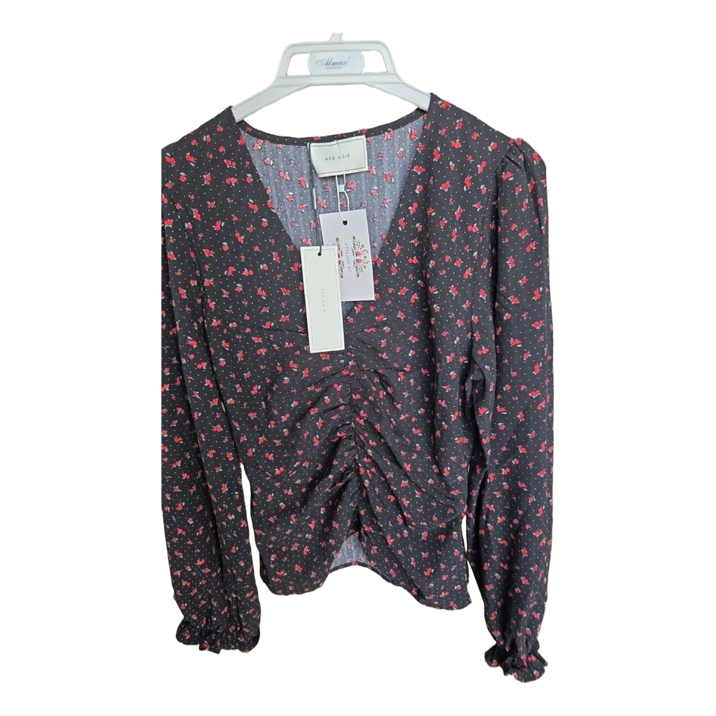 Black floral blouse with long sleeves and ruched front detail. New with tags.