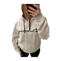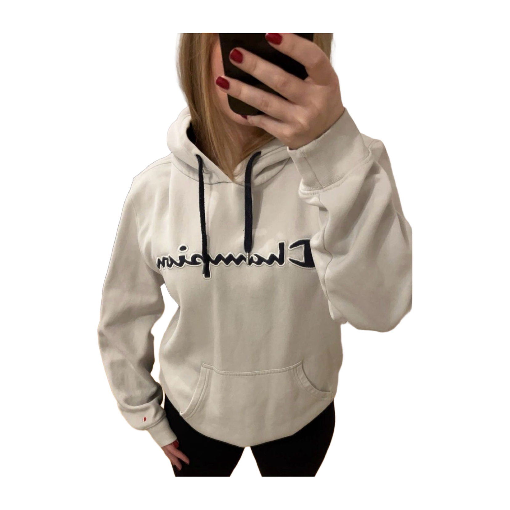 Championin huppari miesten malli. Huppari on käytetty ja muuten hyvässä kunnossa, mutta hihoissa on käytön jälkeä, jotka on korjattu.