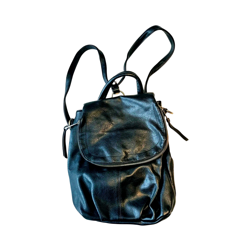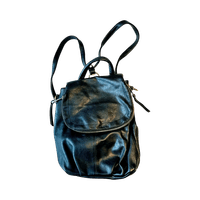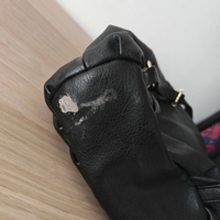 Musta tekonahkainen reppu, pohjassa kulumaa. Eläintalous. Sisällä pieni tasku.