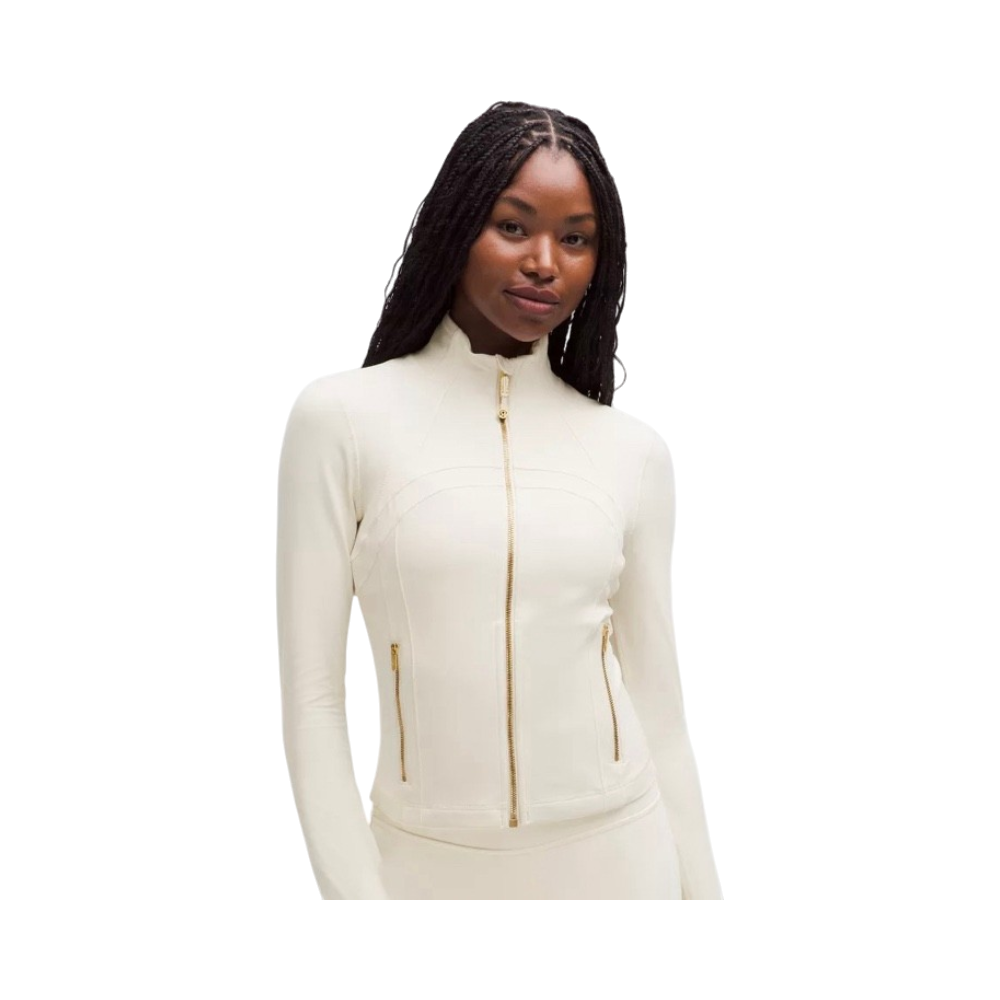 Cream fitted zip-up jacket with thumbhole sleeves, gold zippers.