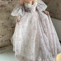 Häivytetty kukkakuvio, off-shoulder ja leveä helma. Vanhojen mekko
