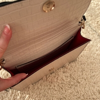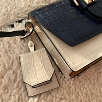 Tyylikäs sinivalkobeige olkalaukku kultaisilla yksityiskohdilla. En ole kertaakaan käyttänyt, vaikkei lappuja ole tallella.