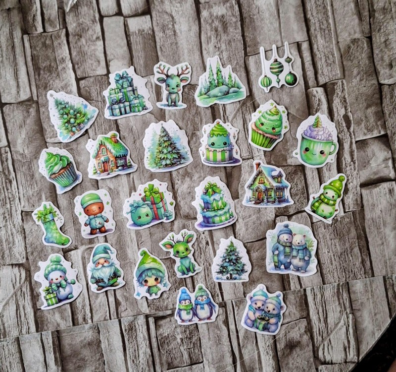 Ihanan vihreitä joulutarroja, kaikki isoja ja näkyy kuvassa 🫶