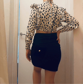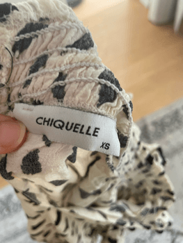 Beige mustavalkoinen crop paita röyhelöillä, koko XS. Chiquellen paita (alunperin mekko, mutta itse ommeltu paidaksi.) Tällä saa helposti tyylikkään juhlalookin tai housuihin yhdistämällä menee hyvin arjessakin! Myös kuvan pikkulaukku myytävänä. Materiaalilapussa 100% viskon- eli ilmeisesti viskoosia. Kuvassa S kokoisen päällä!