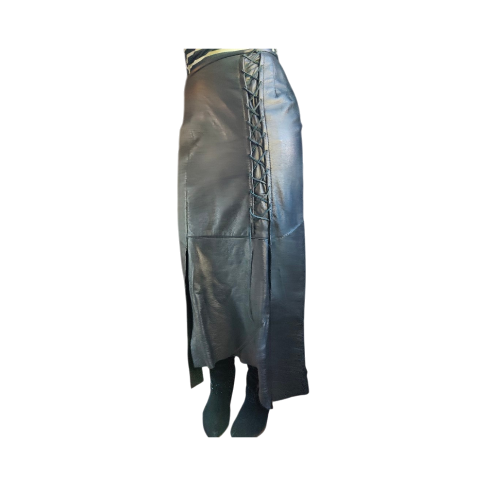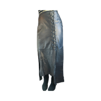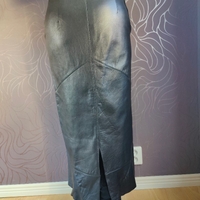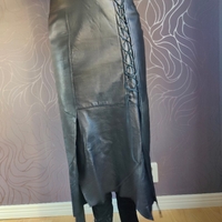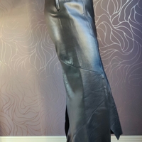 Musta pitkä nahkahame, nyörit vasemmalla puolella, edessä halkiot etukappaleella, takana halkio keskellä. Helma edestä lyhyempi. Vuori on asetaattia.