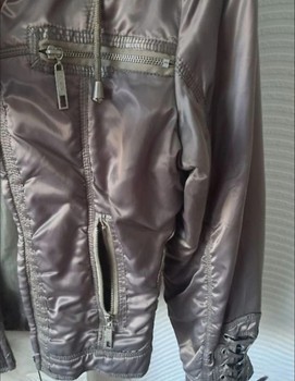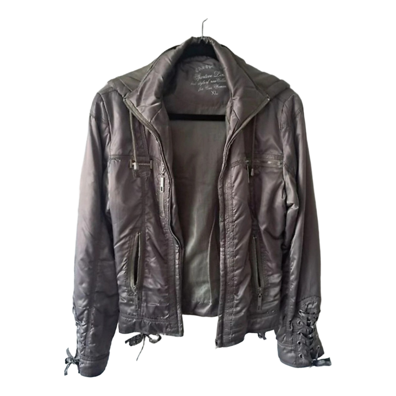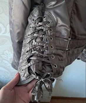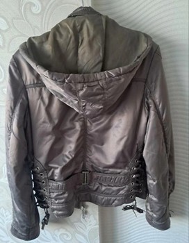 Quilted jacket with hood and lace-up details on the sleeves and sides. Features multiple zipper pockets. Size S.