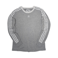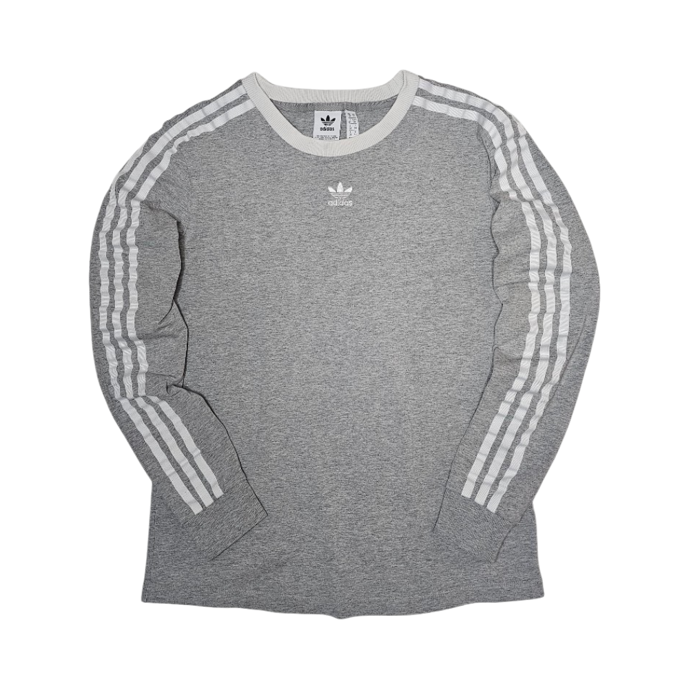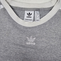 Klassinen harmaa ja valkoiset trefoil-logo rinnassa sekä ikoniset kolme raitaa hihoissa.
