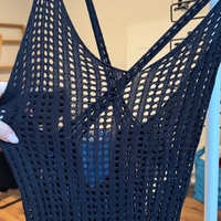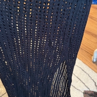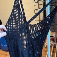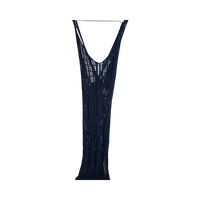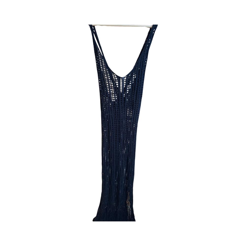 Sleeveless knit crochet maxi dress, sheer beach cover-up style.