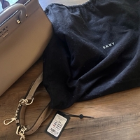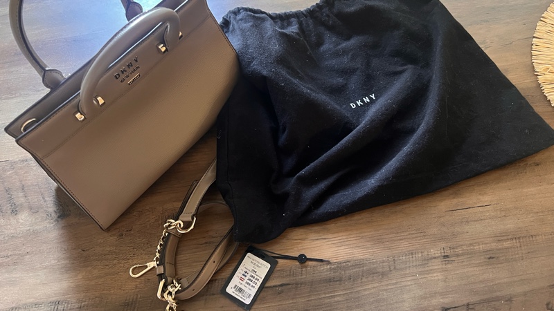 Harmaa DKNY nahkainen käsilaukku kultaisilla yksityiskohdilla.