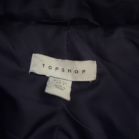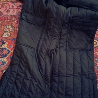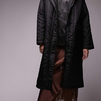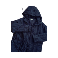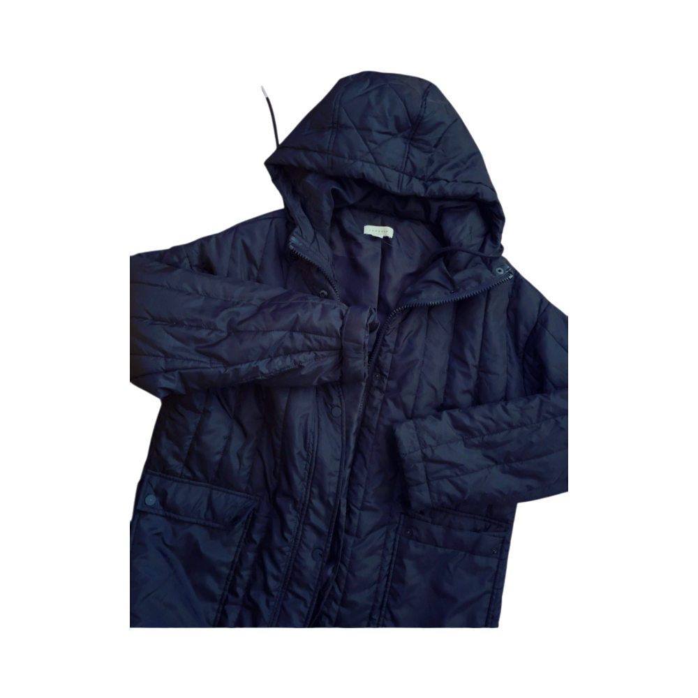 Pitkä toppatakki hupulla, vetoketju ja napit, taskut.