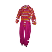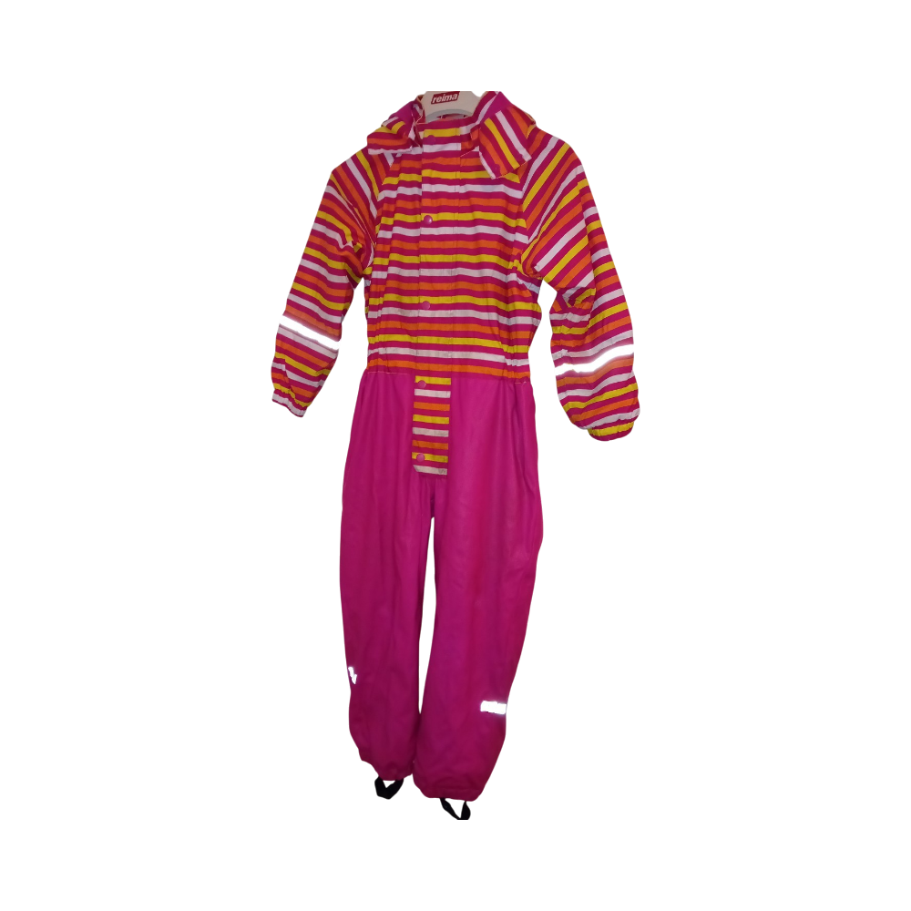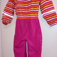 Peuhun vuorillinen, lämmin välikausihaalari, jossa alaosa kurahousua. Etuosassa ja hihansuissa pinttyneempää lilaa, mikä ei ainakaan normaalipesussa ole lähtenyt (siksi kuvat salamalla). Mutta eipä ole menoa haitannut. Vetoketju, napit, jalkalenkit ja irrotettava huppu. Koko110cm, reilua kokoa.
