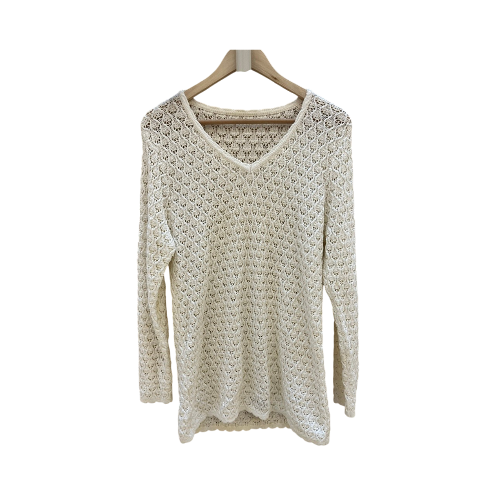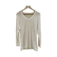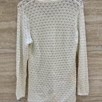 Puuvillainen läpikuultava neulepaita. Koko S-M. Ei muuta merkintöjä, paitsi musta leima paidan sisäpuolella