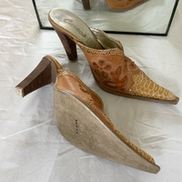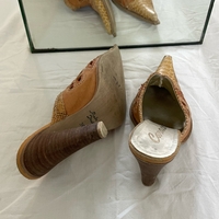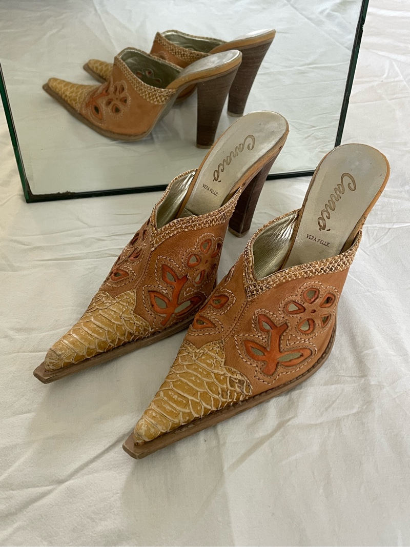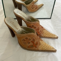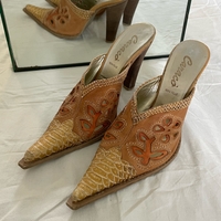 Upeat ruskeat teräväkärkiset avokkaat / korkokengät koristekuviolla