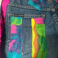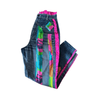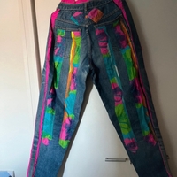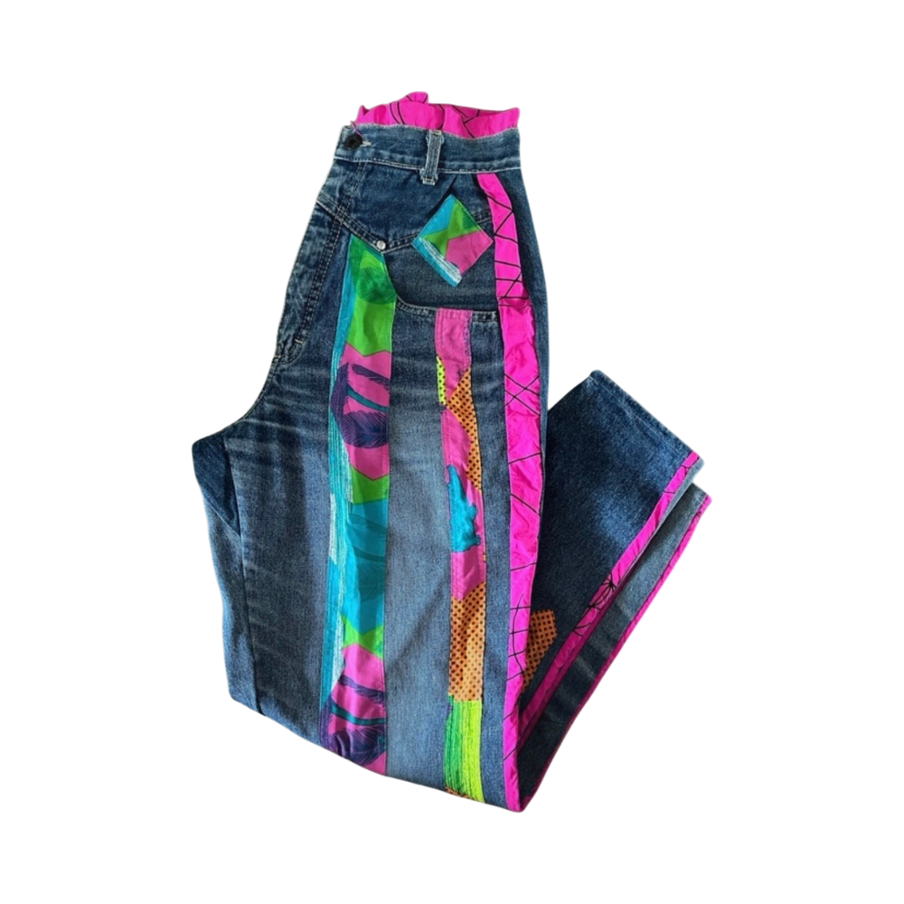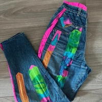 Värikkäillä paneeleilla koristellut farkut, 90-luvun tyyli. Koko XXS-XS