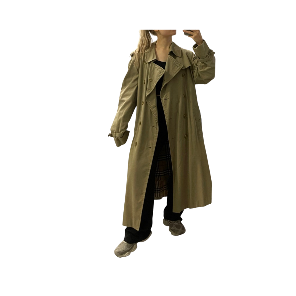 Burberryn beige vintage trenssitakki. Takissa erillinen ”vuori”, joka näkyy viimeisessä kuvassa. Vuori kiinnitetään vetoketjulla.