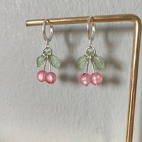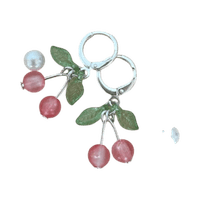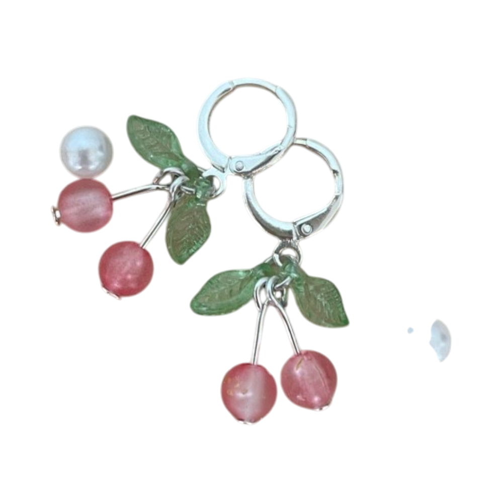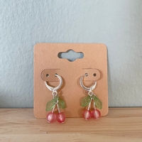 Käsintehdyt vaaleanpunaiset kirsikka-korvakorut vihreillä lehdillä.🍒 Renkaiden halkaisija 10mm.