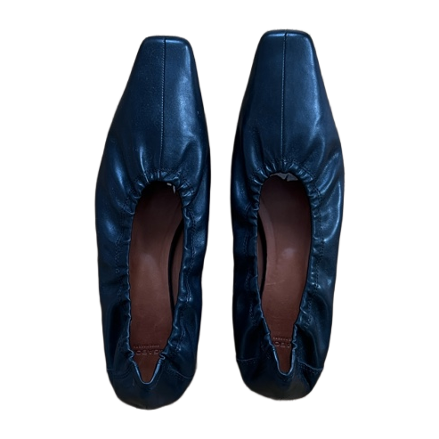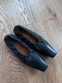 Mustat nahkaballerinat, neliömäinen kärki. Kapea malli, sopii paremmin 39–39,5 kokoiselle jalalle.