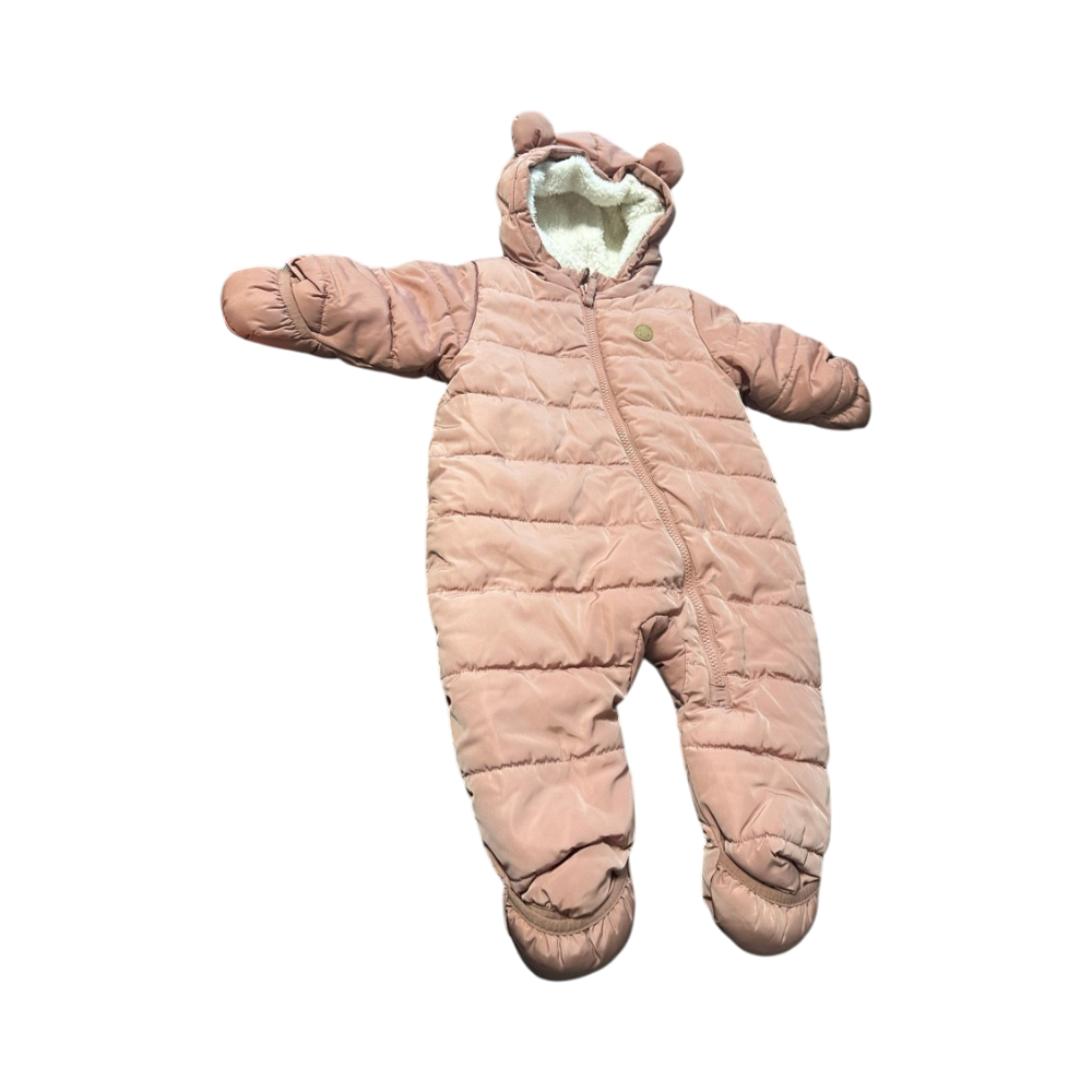 Lämmin, pehmustettu vauvan haalari hupulla ja tossuilla.