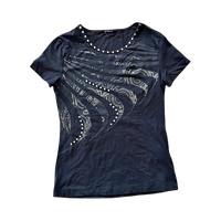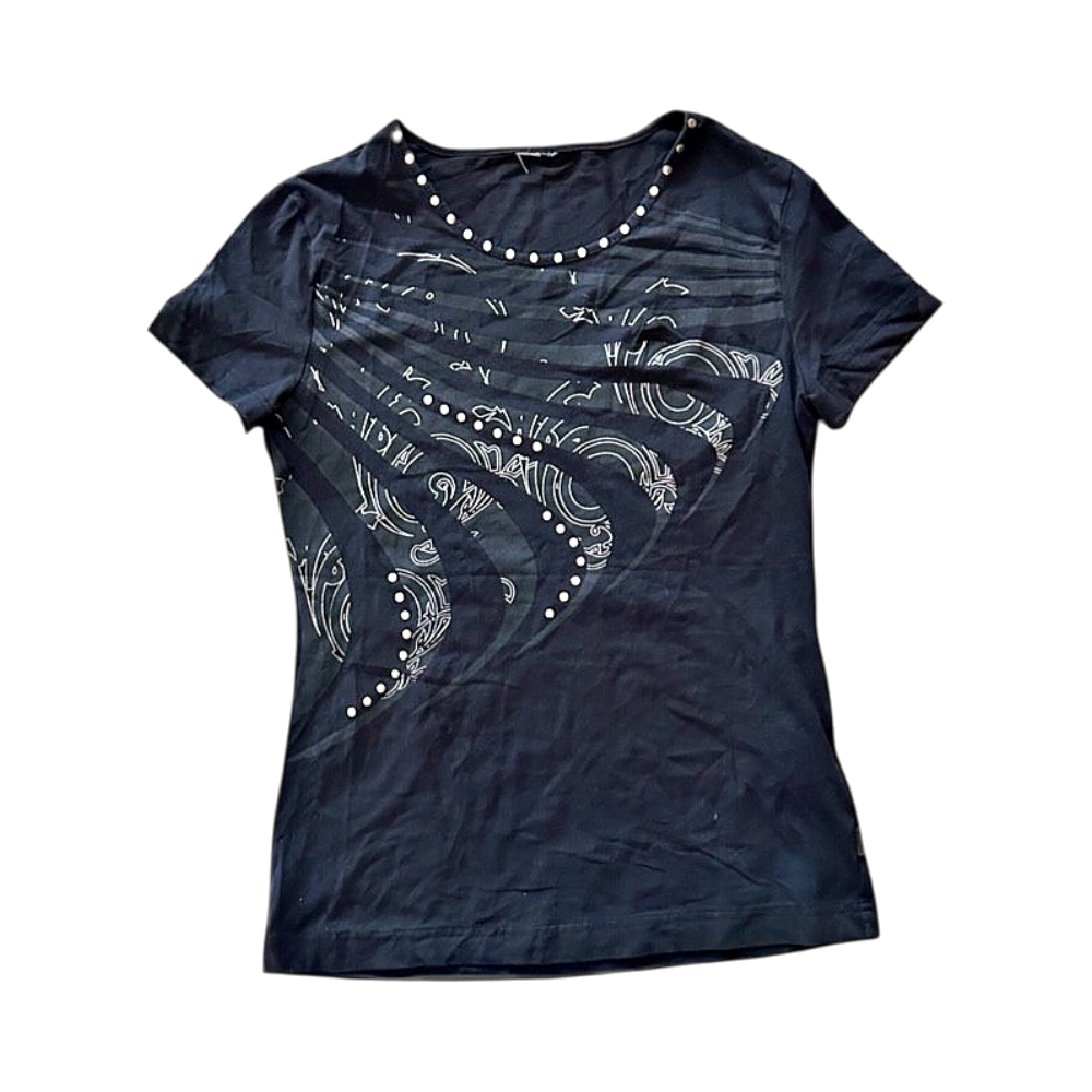Black graphic T-shirt with metal details for sale! 💿