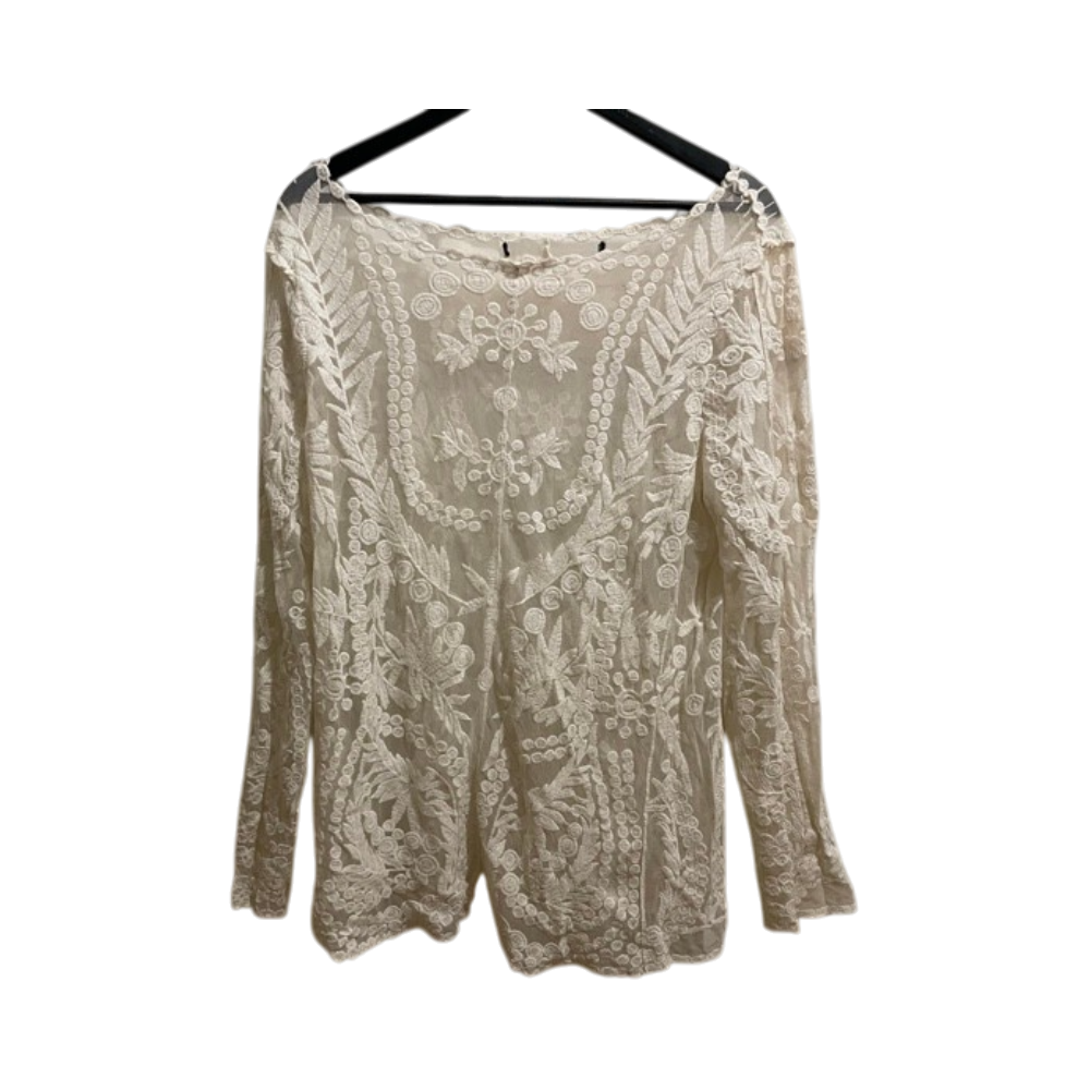 Sheer white long-sleeve embroidered lace blouse, boho style.