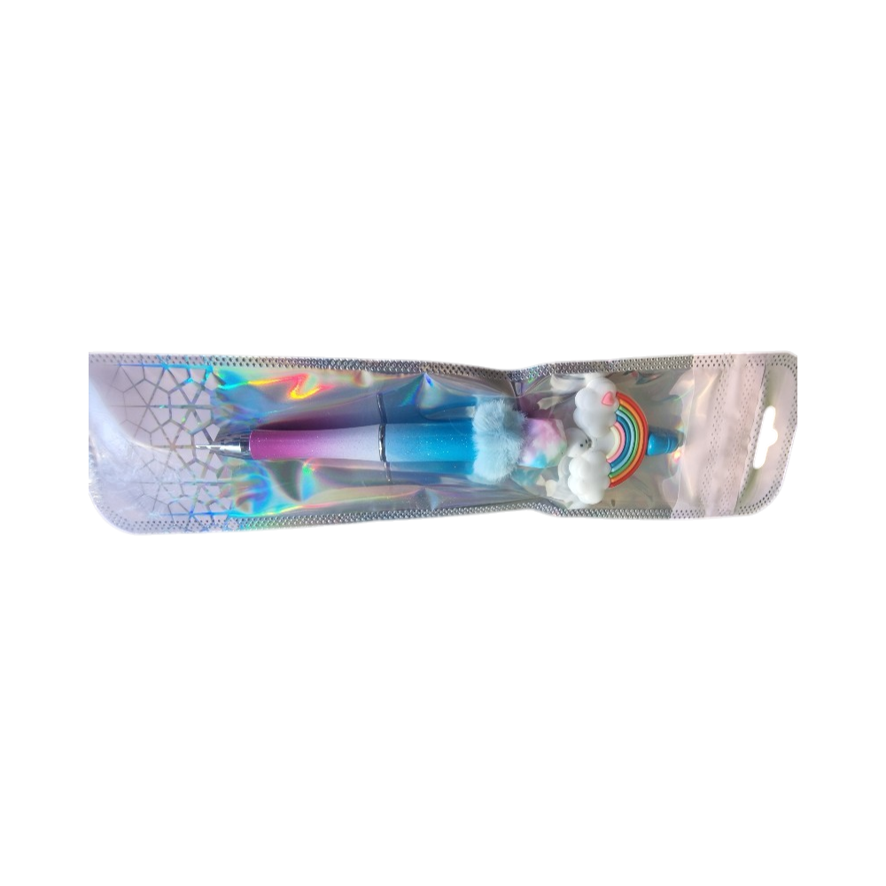 Kaksivärinen geelikynä, koristeellisella pilvi- ja sateenkaarihelmellä.