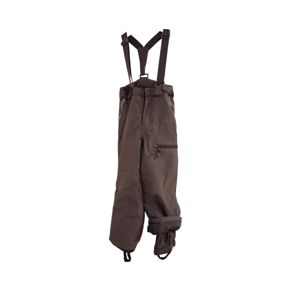Pomp de Lux toppahousut 110/116cm. Ruskehtava väri, kuvassa näyttää aavistuksen todellista haaleammalta. Vuorikerros lahkeessa erikseen kiristettävissä (näkyy kuvassa). Leveät säädettävät henkselit ja reisitasku aarteille. Hyvä kunto.