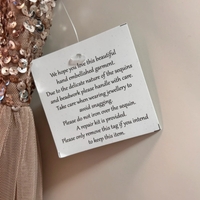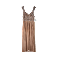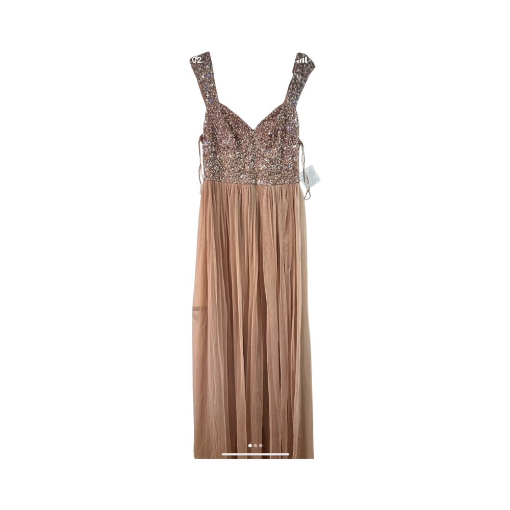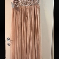 Pitkä tyllimekko, paljetti- ja helmikoristelu, juhlava.