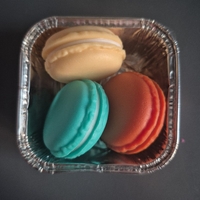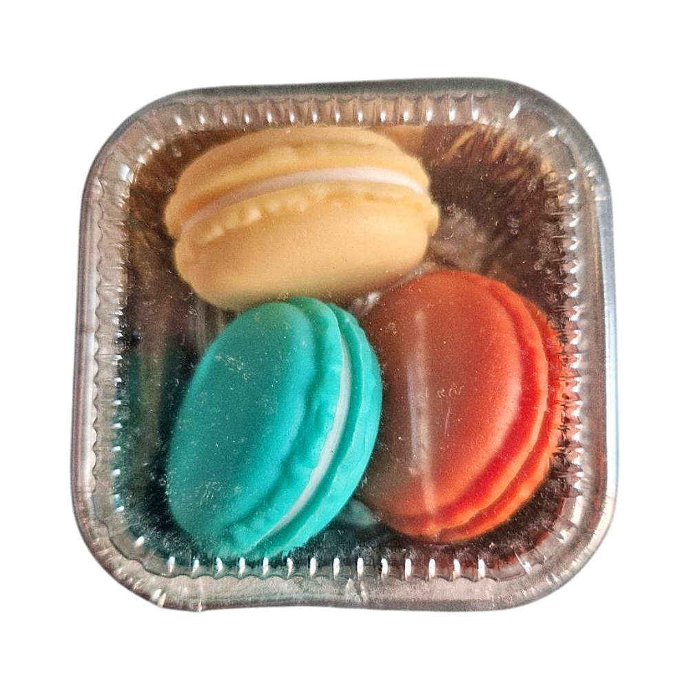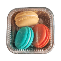 Kolme värikästä macaron-leivosta foliovuoassa, myydään pakattuna