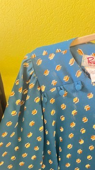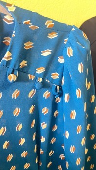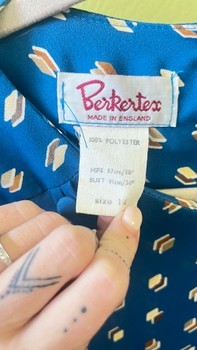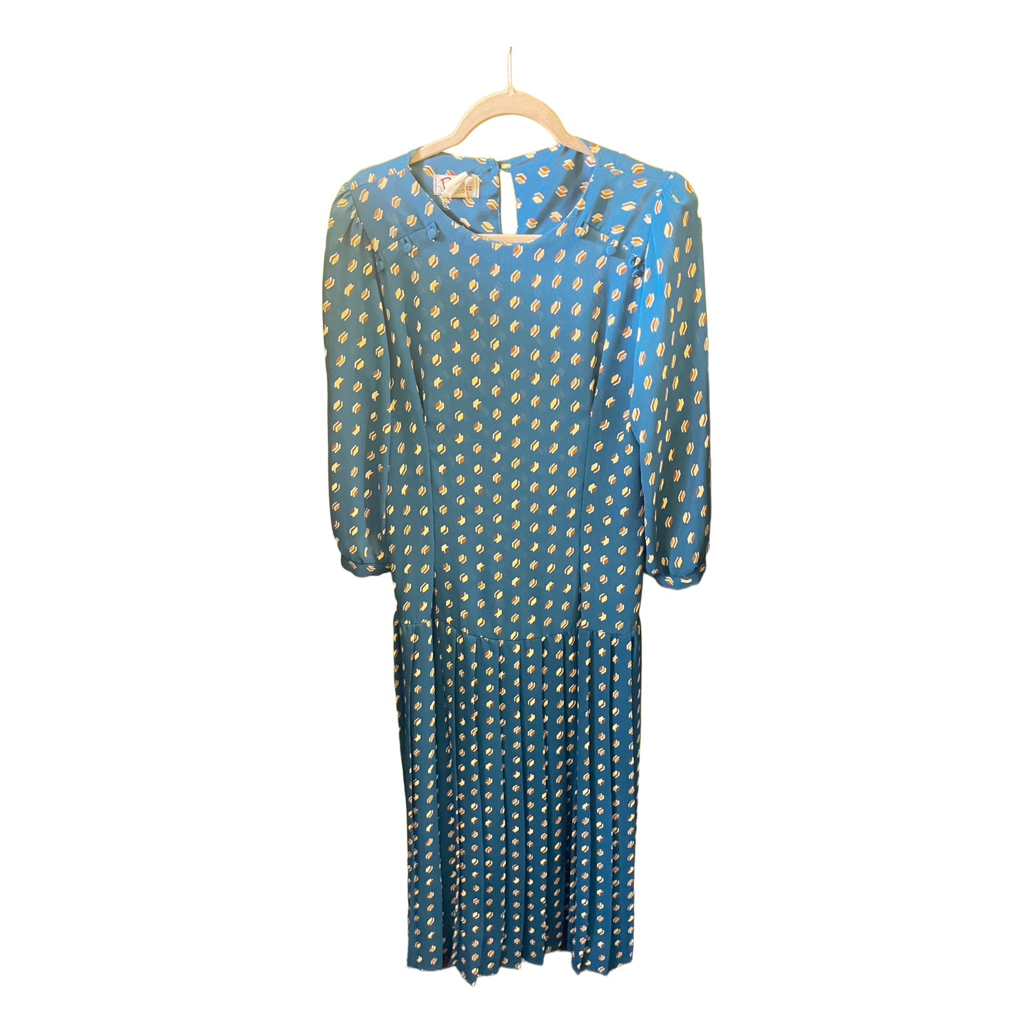 Vintage blue midi dress with a geometric pattern. Features long sleeves, pleated skirt, and button detailing. Made of 100% polyester. Size 14.