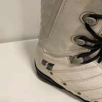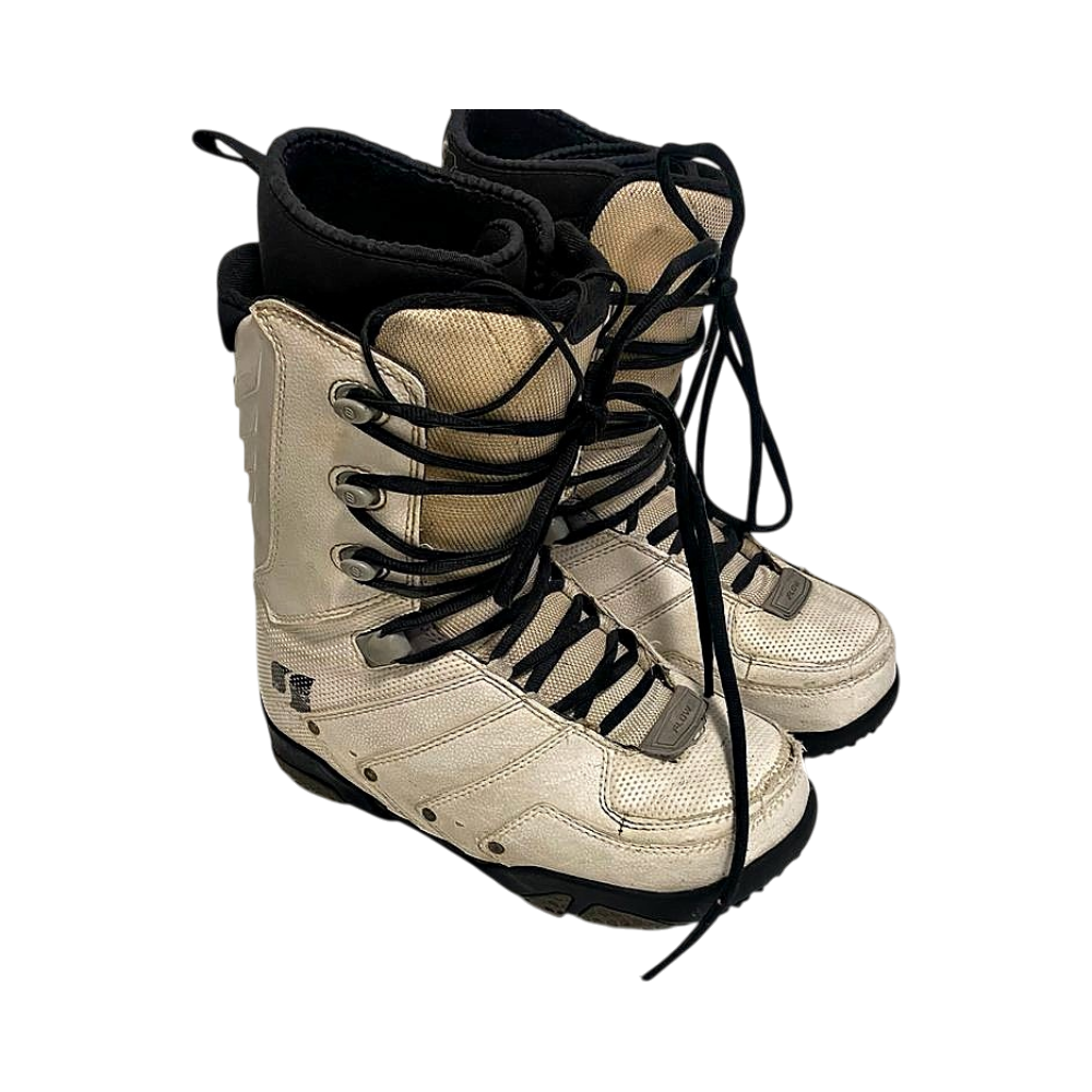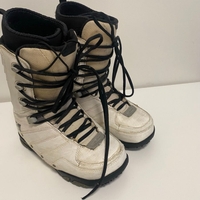 snowboard boots, Flow Decade, white snowboard boots, unisex snowboard boots, lace-up boots, used snowboard boots, project boots, repair needed boots, winter sports gear, snowboard equipment, beginner snowboard boots