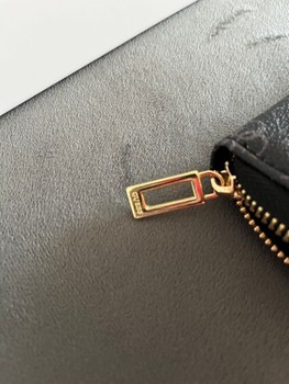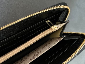 Black wallet featuring an all-over monogram pattern and gold-tone details. Zip-around closure with a branded zipper pull, including original box.