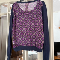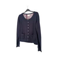 Navy cardigan with a sheer, abstract pattern on the back by Lindex. Elegant and lightweight, perfect for layering. Good condition with some wear on the gold-colored buttons. Size large.