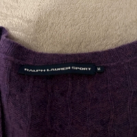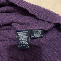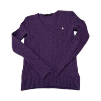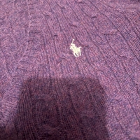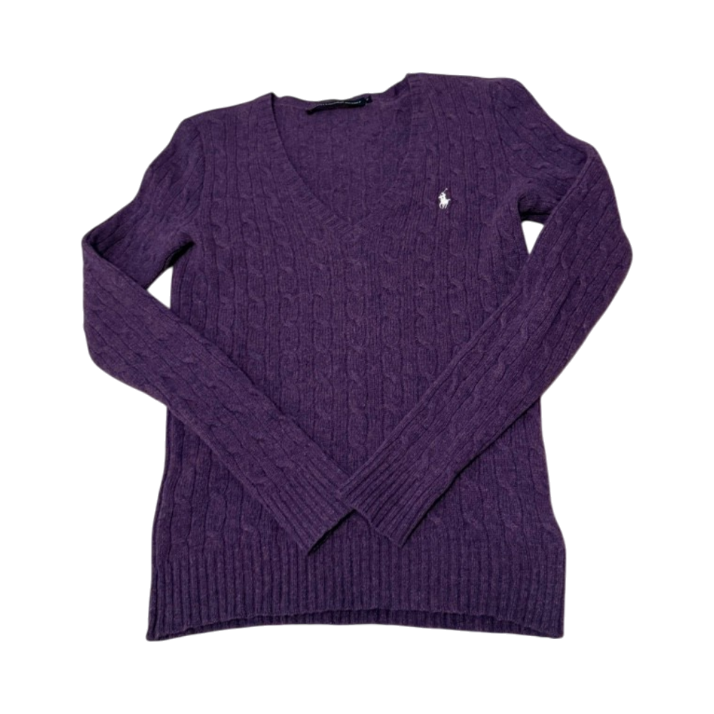 Purple cable-knit women's sweater with embroidered logo, medium.