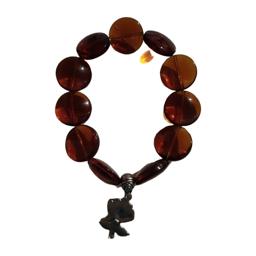 Ruskea helmirannekoru hopeanvärisellä riipuksella.