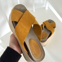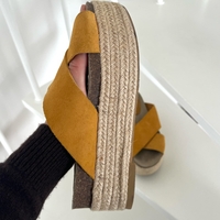 Mangon mokkanahkaiset ristiin päältä menevät sandaalit. Paksut juuttipohjat. Koko 38, mutta sopivat mielestäni 38-39. Vähän väljempää mitoitusta siis. Yhdessä reissussa olleet mukana, edelleen siistit. Hyvin vähäistä jälkeä. Mukavat jalkaan.