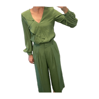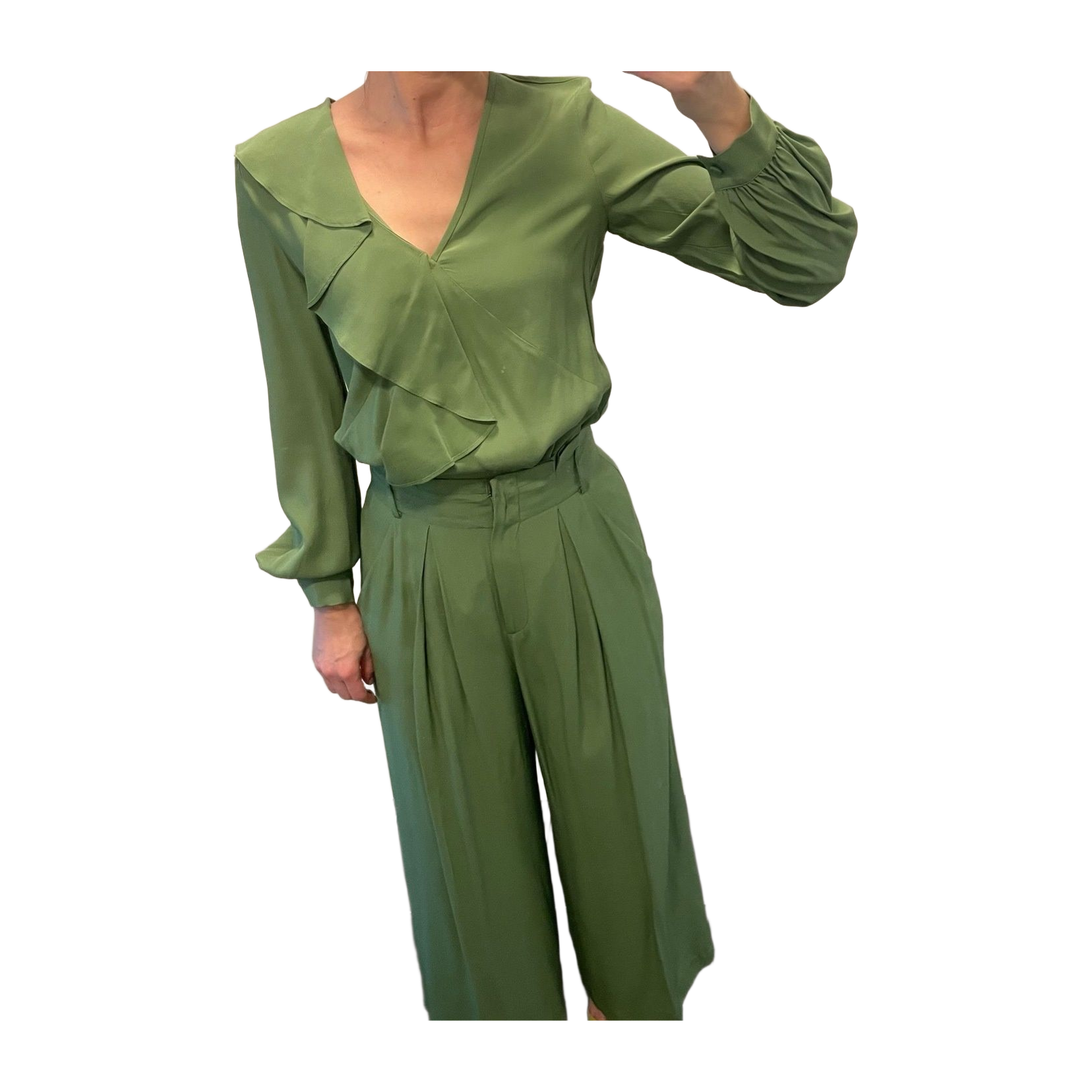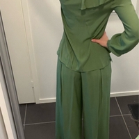 Kaunis, käyttämättä jäänyt housuasu juhlaan, arkeen tai esim töihin. Väri ei itselleni optimi, vaikka kaunis onkin. Myyn settinä, housut 4/S ja paita 2/XS. Housut kapeimmasta kohdasta optimit noin 70cm vyötärölle.