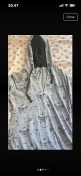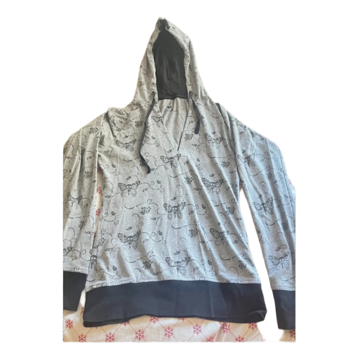 Grey long-sleeved hoodie with a black skull and butterfly print pattern. Featuring a black trim at the hem.