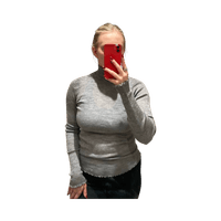 Kevyt ribbineulos, istuva pitkähiha, röyhelöreunat helmassa ja hihansuissa. M/L