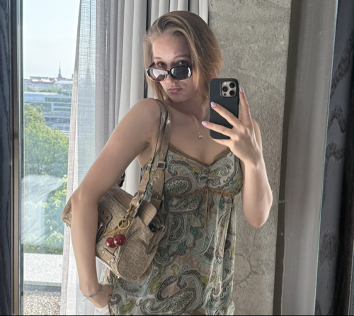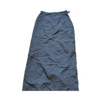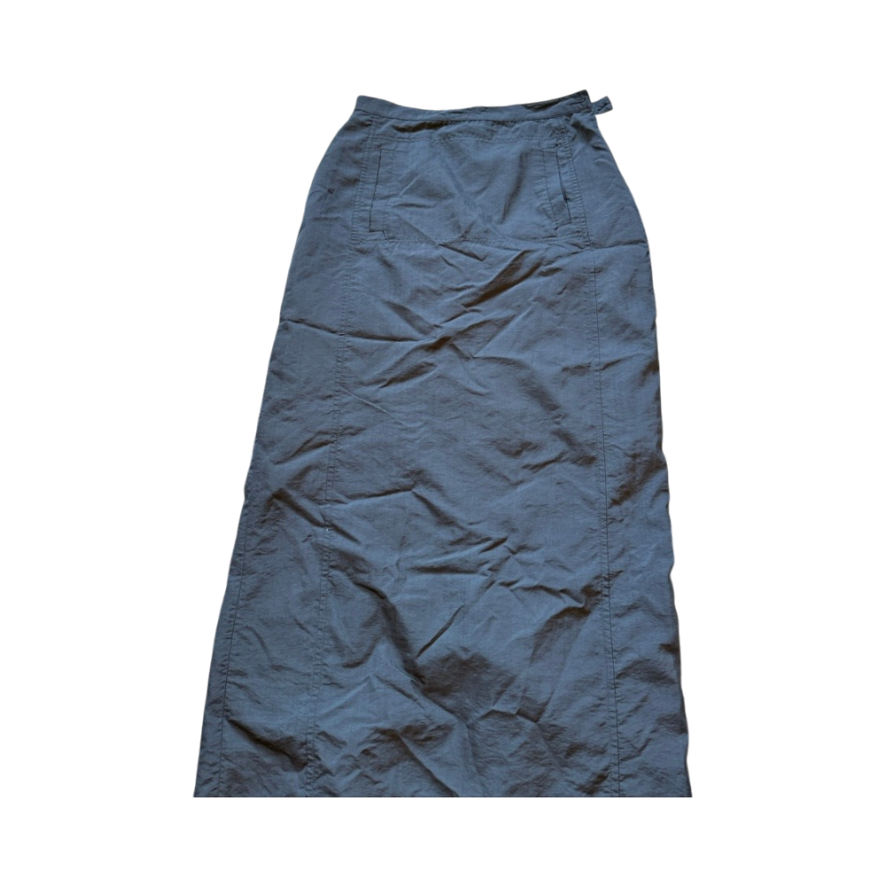 High-waisted long navy skirt with front pocket.
