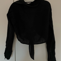 Pitkähihainen musta paita syvällä pääntiellä ja solmittavalla etuosalla.